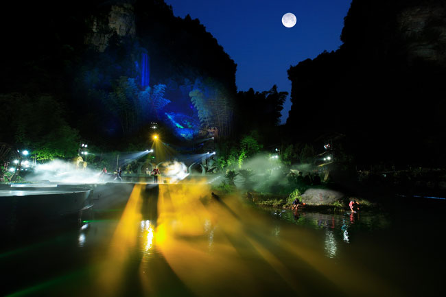 《武陵魂•梯瑪神歌》是一場記述土家族起源、演變、戰(zhàn)爭、生產生活等內容的大型立體山水實景演出,揉合了音樂、舞蹈、文學等多種藝術形式,如幻如夢的舞美燈光,搖曳生姿的原生態(tài)歌舞……濃縮了土家族數(shù)千年的發(fā)展歷史,400多名演員以自然淳樸的表演充分的展示了土家的民族文化特征,給游客帶來了耳目一新的感受。一場視聽的饕餮盛宴,一曲驚天地、泣鬼神的曠世古歌,給人山水文化光影視聽的享受!境銎罚簭埣医缣莠斏窀栉幕瘋鞑ビ邢薰尽