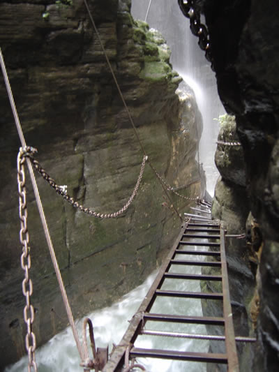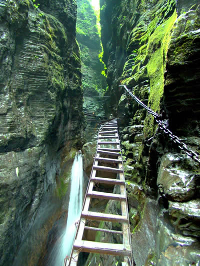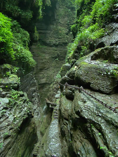 坐龍峽擁有中國(guó)第一條特種游道。所有游道均建于峽谷深處,依山取勢(shì),既經(jīng)細(xì)心雕琢聽卻又渾然天成。粗樸的板栗木棧道,可以讓你零距離的親近那一潭碧幽、聽聞山泉叮咚;精巧的跳墩,可以讓你媳戲流泉、觸感溪瀑;原質(zhì)的石坎道,讓你不得不調(diào)動(dòng)全部的身心能量悉心攀援、感悟峽谷;有驚無險(xiǎn)的鐵梯,讓你伴著腳下轟鳴的溪水,在驚怵中體味一份快慰。出口處的土家山寨,保留了古樸獨(dú)特的生活習(xí)俗。一塊臘肉就一口醇香的“苞谷燒”會(huì)讓你洗去所有的疲憊,在輕松中憨厚的主人向你講述過去強(qiáng)人出沒的故事......