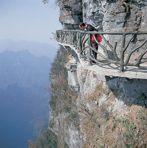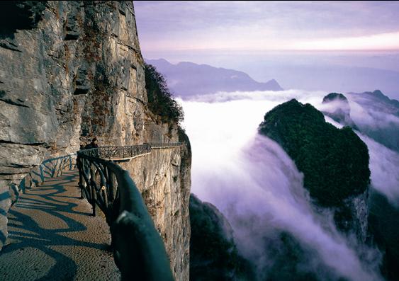 天門山鬼谷棧道圖片 棧道全長1600米,平均海拔為1400米,起點是倚虹關,終點到小天門。與其他棧道不同的是,鬼谷棧道全線既不在懸崖之巔,也不在懸崖之側,而是全線都立于萬丈懸崖的中間,給人以與懸崖共起伏同屈伸的感覺。