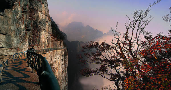 鬼谷棧道的秋天 據施工人員介紹,此條棧道也是他們所修棧道中施工最難,最險峻的一條。如果您還覺得不夠刺激的話,在棧道的完結處的兩個懸崖之間有一條長160米的懸索吊橋,同時,在海拔最高點還有一個挑戰(zhàn)心里極限的玻璃站臺,在這里,如果你能挺直腰板伸開雙臂,那么,您就是真正的勇士了。