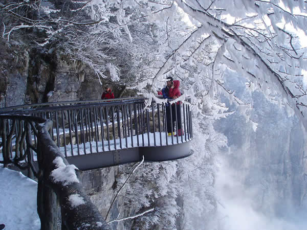 鬼谷棧道雪景圖片 如果是雨前雨后,在棧道上則是身邊霧氣盤繞,腳下云海翻騰,令人抬腿似生霧,邁步如踏云,人間天界,世外洞天也就是如此了。