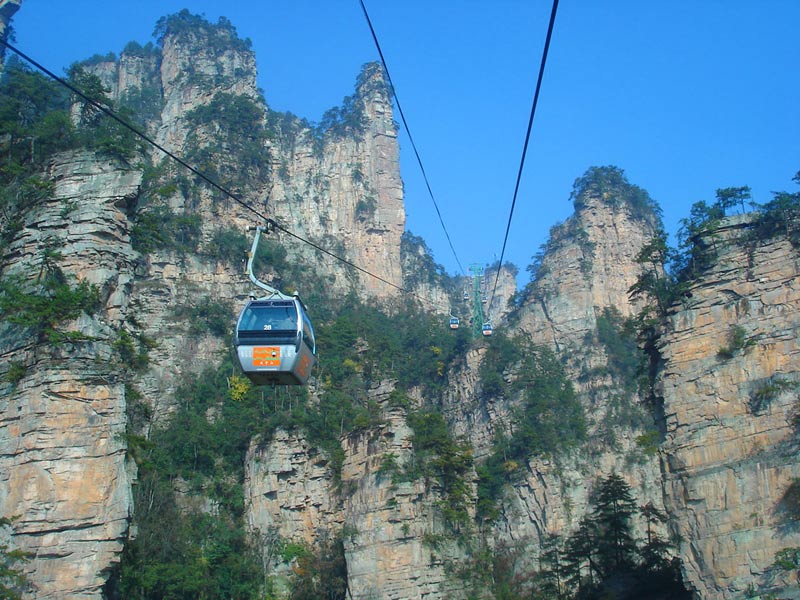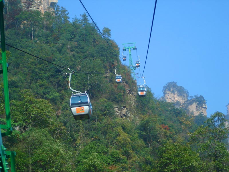 天子山索道 天子山索道的建成開通,極大地改善了武陵源風(fēng)景區(qū)的旅游交通環(huán)境,使游人花半日功夫上得天子山來只看一眼的遺憾,變成了間歇飛渡上山便可盡覽天子山這“擴大的盆景,縮小的仙境”的迷人景色之享受。乘坐天子山索道,既舒適又安全,沿線風(fēng)光奇絕,奇松怪石,莽莽翠林,幽幽泉水,嬉戲獼猴,盡收眼底,令人嘆為觀止。尤其在云霧繚繞之時,游客乘坐索道更能體驗到神仙飄逸飛行的動感與刺激。