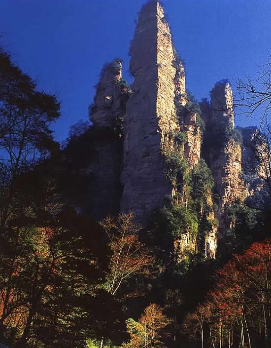 | 金鞭巖:過“閨門峰”沿溪而下約500米,有一座高約400米,孤標(biāo)直立,雄奇挺拔的奇峰,名金鞭巖。金鞭巖是武陵源著名景點(diǎn),峰體上細(xì)下粗,四棱分明。棱面布滿節(jié)理橫紋,形成鞭節(jié),渾如一根豎插大地的長鞭。每當(dāng)夕陽晚照,鞭身涂金,熠熠閃光,瑰麗奪目,構(gòu)成一幅奇特壯美的“夕陽金鞭圖”。