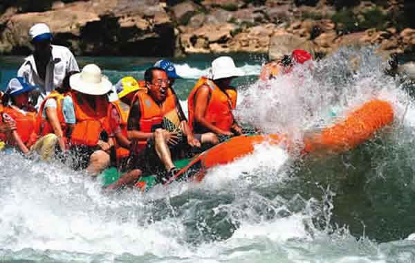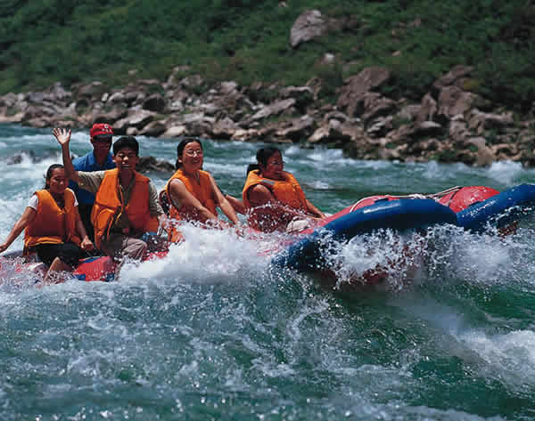 茅巖河漂流 茅巖河不僅是水的彩圖,也是山的國(guó)畫。兩岸青山綿延,萬木蔥籠,峭壁對(duì)峙,溝深谷幽,洞穴密布。刀削似的峭壁上古松斜掛。老鷹、烏鴉、黃雀成群盤旋于峰尖,嗚叫于峭壁。