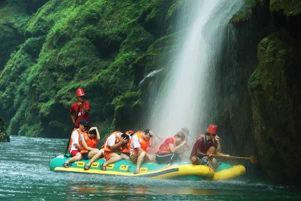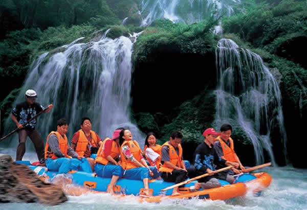 茅巖河漂流 茅巖河沿途的眾多飛瀑流泉中,尤以水洞瀑布最為壯觀迷人。瀑布從70多米高的峭壁瀉出,漫流過三級(jí)凸凹不平的峭壁,形成長(zhǎng)短不一的三疊,瀑水在每級(jí)的石臺(tái)上漫過突兀出來的溝溝槽槽飛流而下,或?qū)捜玢y河,或窄似白練,或似垂掛的水簾,或似串串銀珠,飛落茅巖河中,撞擊得河水顫顫悠悠,鱗光閃閃。