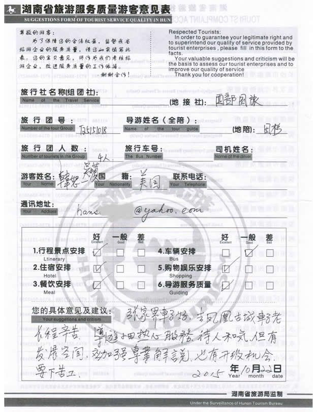 現(xiàn)在位置:首頁 -> 西部國旅->旅游質量反饋 -> 2015-10-18 臺灣韓先生一行4位貴賓 天門山、張家界、天子山、鳳凰古城四日游