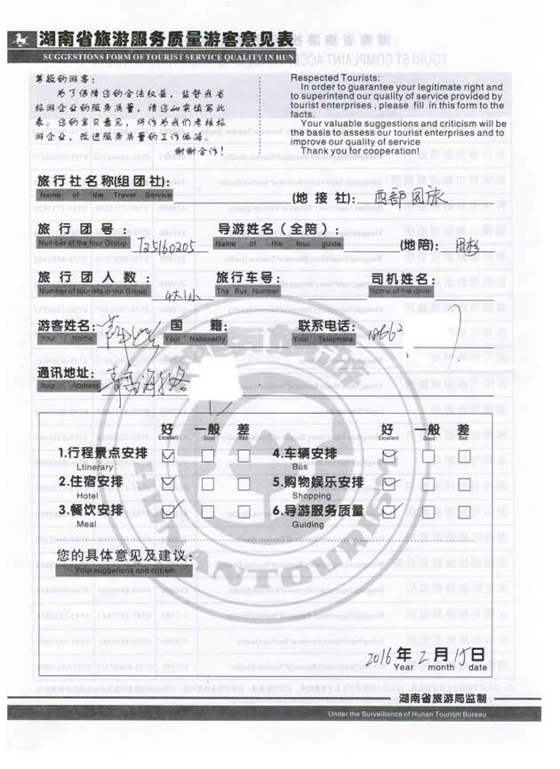 現(xiàn)在位置:首頁 -> 西部國(guó)旅->旅游質(zhì)量反饋 -> 2016-2-11 青島薛璐一行5位貴賓張家界、袁家界、黃龍洞、鳳凰古城四晚四日游